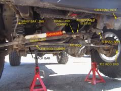 DRAG LINK: The drag link start on the pitman arm and attach on the passenger side knuckle. It move the wheels left and right with the tie rod. The Dampener (steering stabilizer) also attach to the drag link.