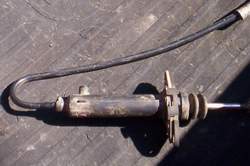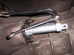 Installation – There is no need to remove the upper clutch master cylinder. Simply unbolt the lower clutch slave from the bell housing (two ½" socket nuts). (Fig 2) Next cut the plastic hydraulic line just back from the cylinder as there is a steel insert that’s about 2" back from the cylinder. Now for the hardest part of the whole operation is removing the snap ring that holds the mount flange to the cylinder. I used an angle grinder, but I had a real hate on for that cylinder! Two screwdrivers should do the trick. Once you get the metal flange off, you are done with the cylinder. Throw it away!